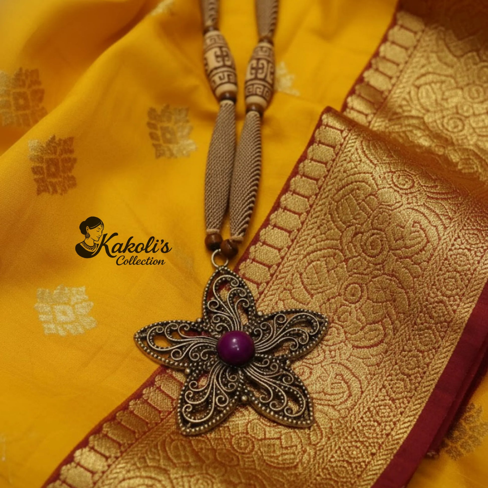 This elegant dokra jewellery set features a detailed floral metal pendant as the centerpiece, paired with matching bead-drop earrings. The strand is finished with textured wooden beads and tassel-style elements, giving it a warm, rustic look that suits both sarees and contemporary ethnic outfits.