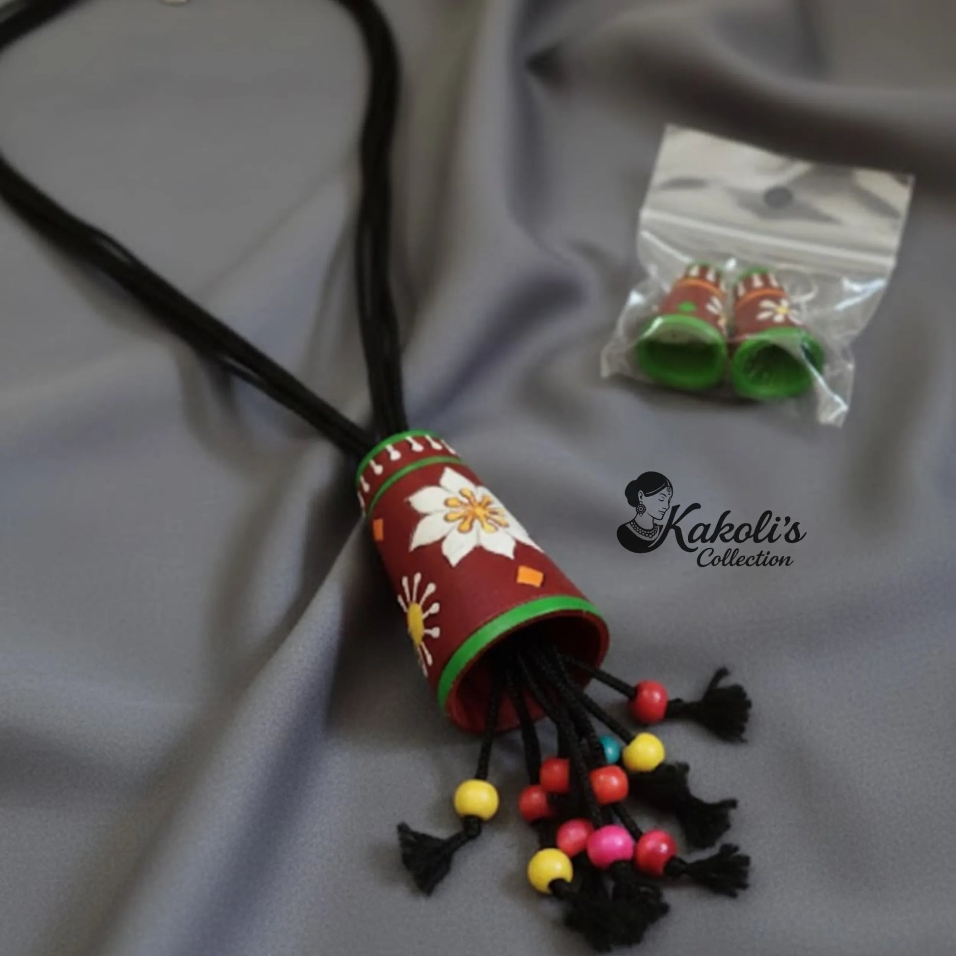 This handcrafted terracotta set features a bell-shaped pendant with matching drops, adorned with playful hand-painted floral motifs for a cheerful, folk-art look. Finished with multiple tassel cords and colourful beads, it adds a fun, boho touch to kurtis, dresses, and festive outfits, perfect for brightening up everyday style or special occasions.