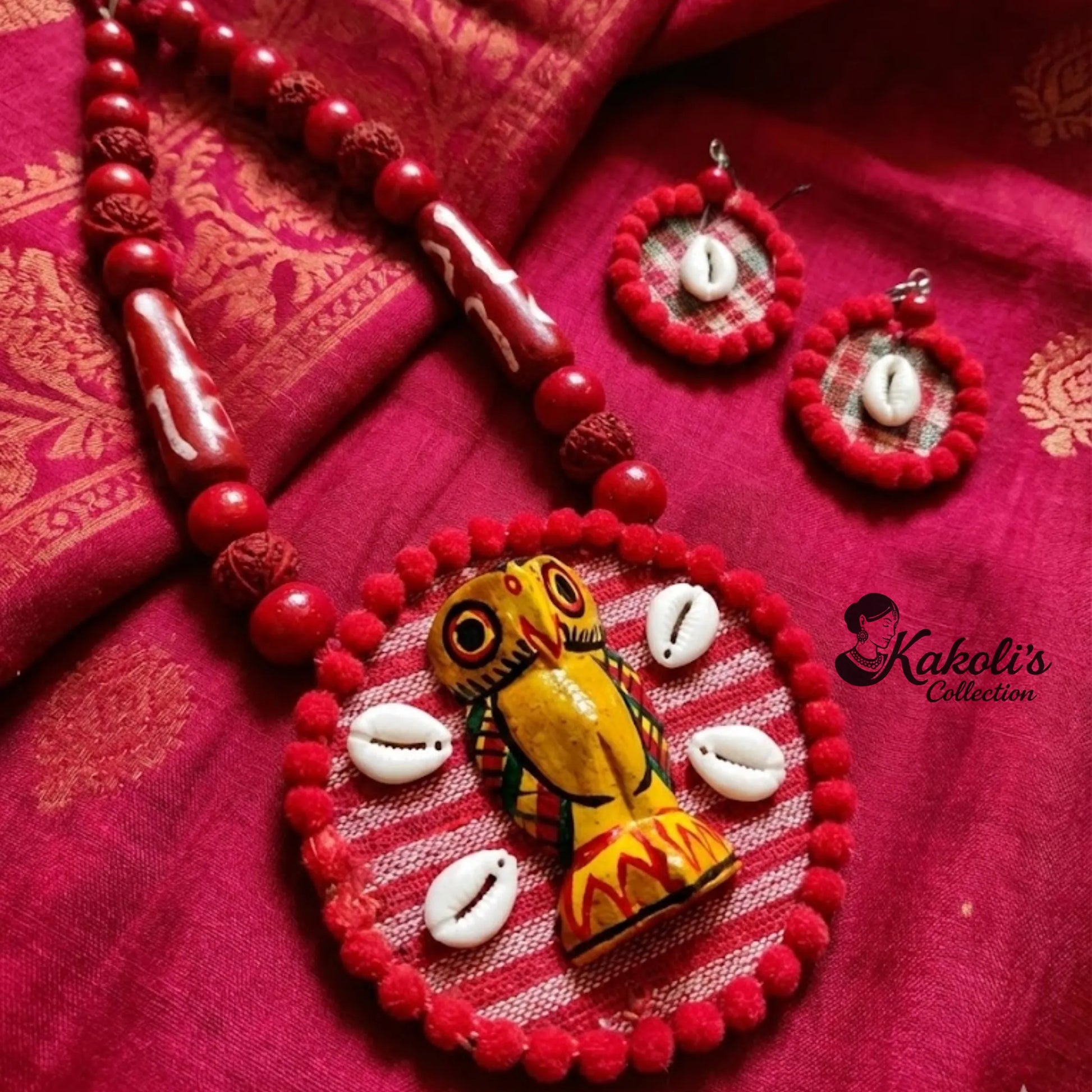 This handcrafted fabric-based set features a carved wooden owl centerpiece framed by cowrie shell-inspired detailing, paired with matching round earrings for a coordinated look. Accented with polymer beads along the strand, it blends folk-art charm with coastal elements, making it a unique statement piece for festive and casual ethnic wear.